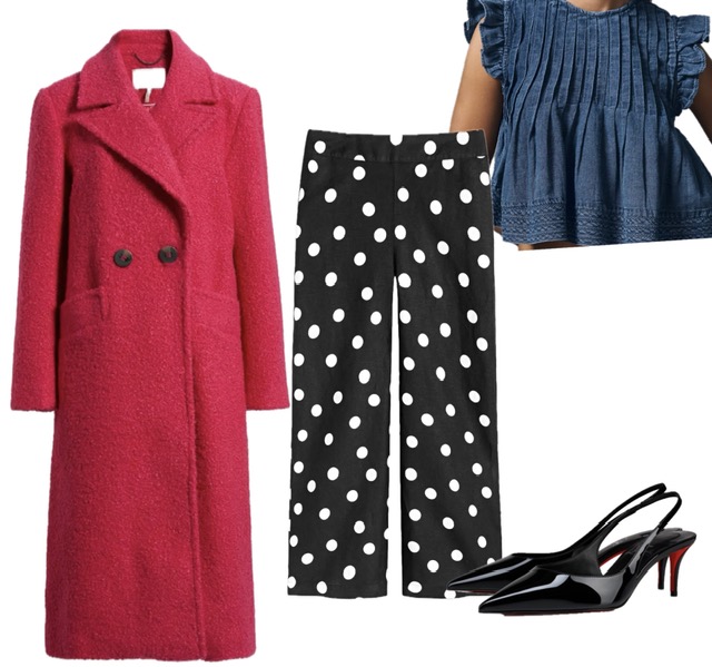 My most favorite polka dot combo paired with bright color trench coat and this cute...